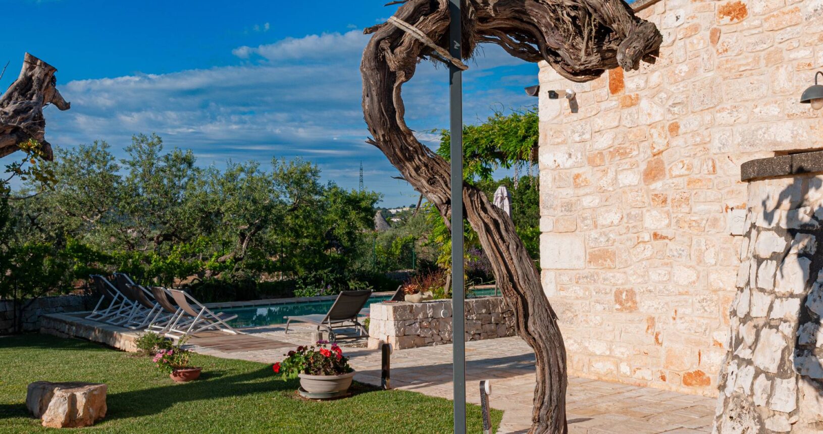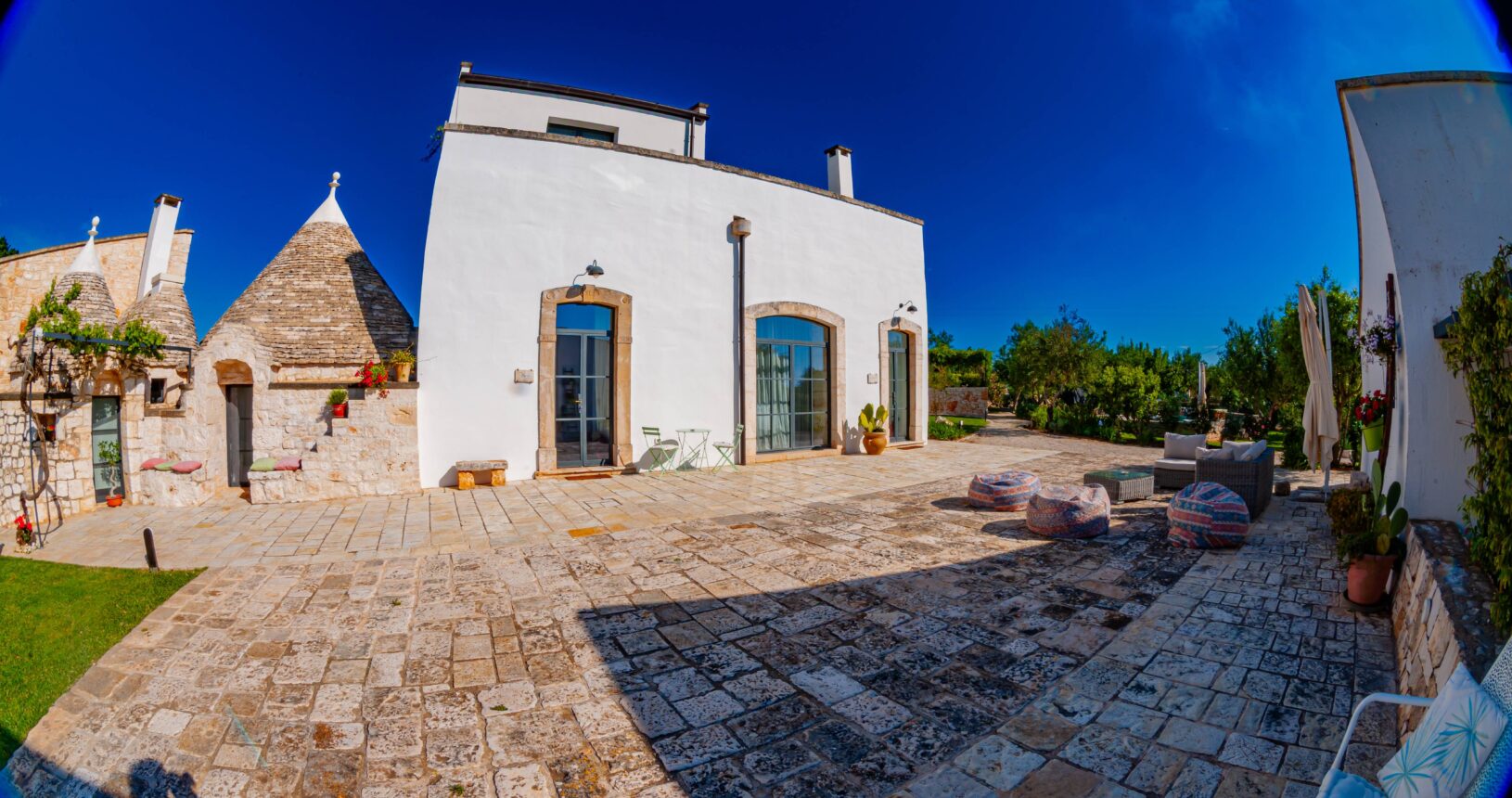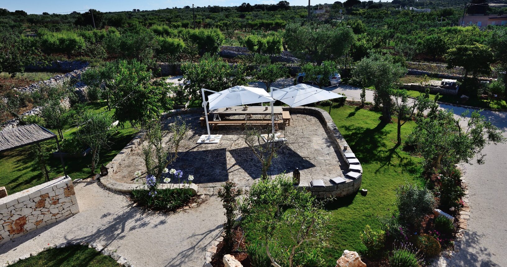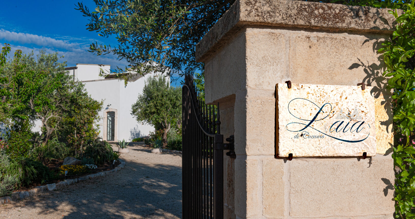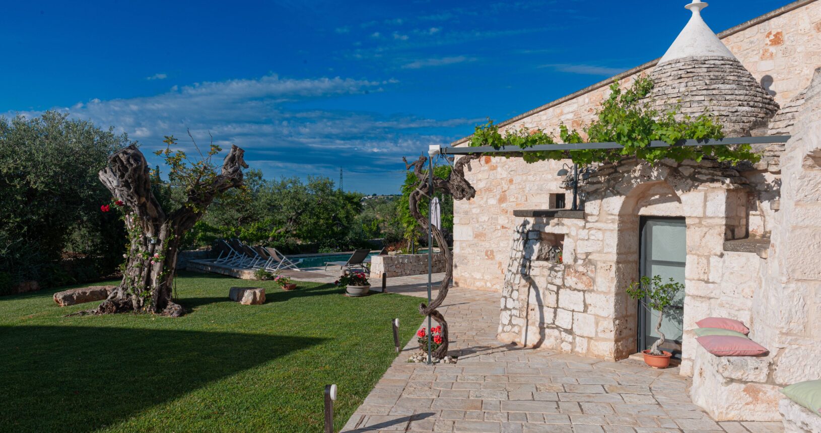 L’Aia di Cucumo è situata in una posizione panoramica del comune di Castellana Grotte, località conosciuta per le sue grotte sotterranee tra le più belle d’Italia, e dista circa 15 km da Alberobello, “la città dei trulli”, e 6 km da Putignano, conosciuta per la sua nota sfilata dei carri a Carnevale. Le è stato dato questo nome in quanto la struttura possiede una delle poche aie nella zona (ampia area in pietra di forma rettangolare che fino agli anni ‘70 serviva per battere e ventilare le spighe di frumento e separare la paglia dal grano) rimaste ben conservate, probabilmente l’unica nella contrada denominata “Cucumo”. Composta da quattro unità abitative indipendenti denominate Lamia, Fienile, Granaio e Palmento, per ricordare la destinazione d’uso che avevano in passato, L’Aia di Cucumo può ospitare fino a 18 persone, oppure essere locata per singoli appartamenti, condividendo in tal caso gli spazi in comune con altri ospiti. La struttura è dotata di una piscina rettangolare in pietra, un barbecue attrezzato per cucinare all’esterno e una serie di piccoli orti per la coltivazione di ortaggi di stagione a disposizione degli ospiti.