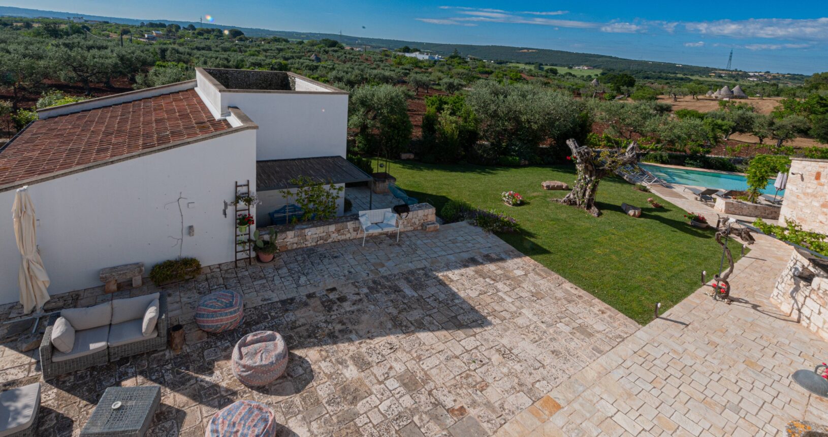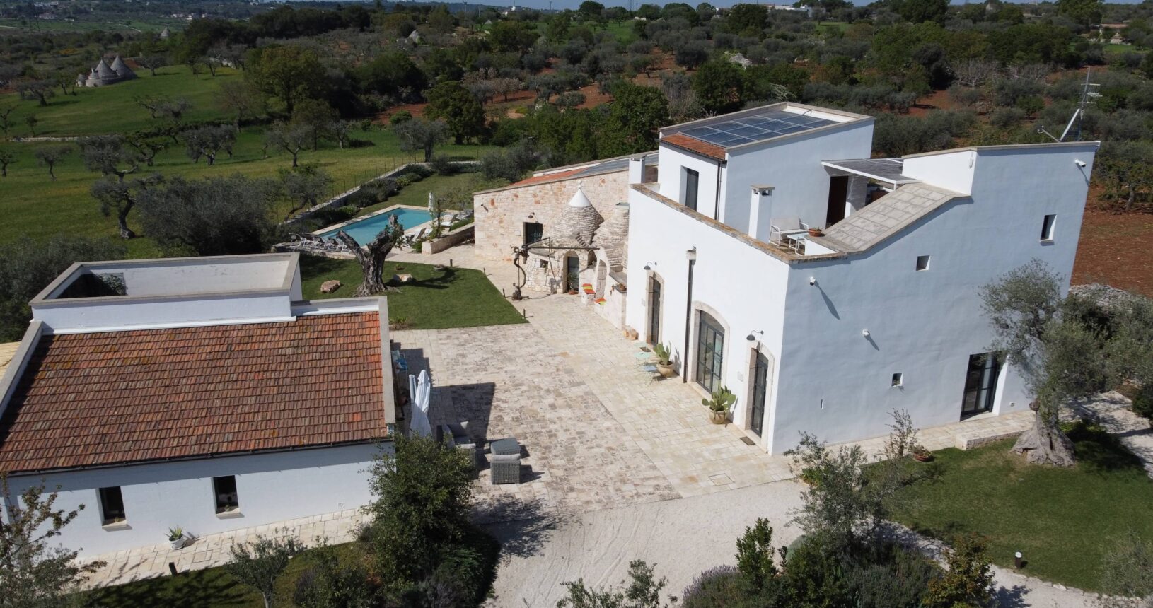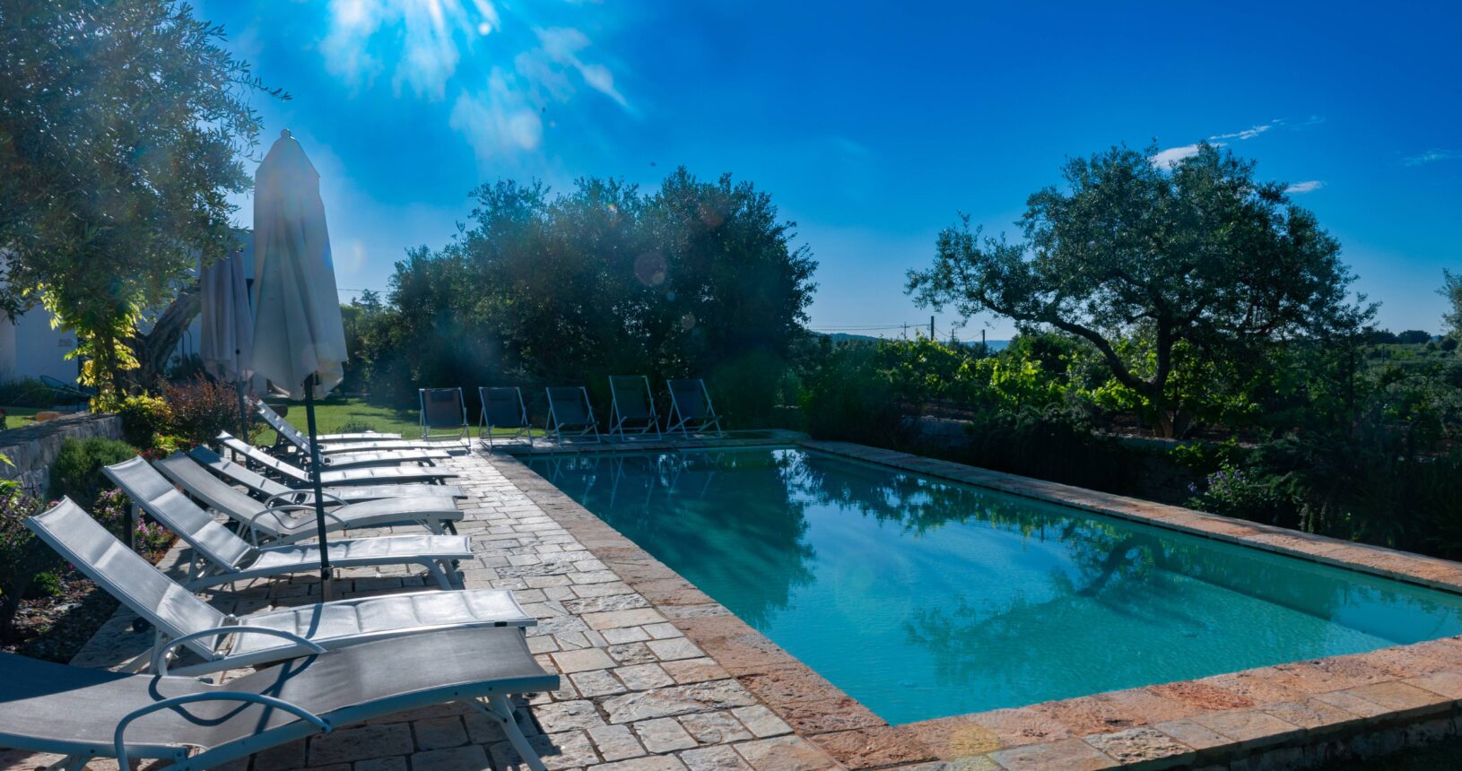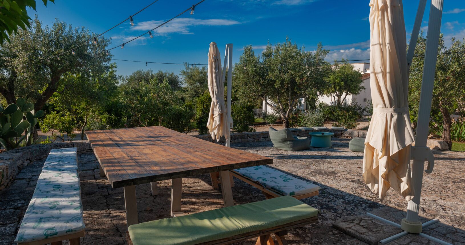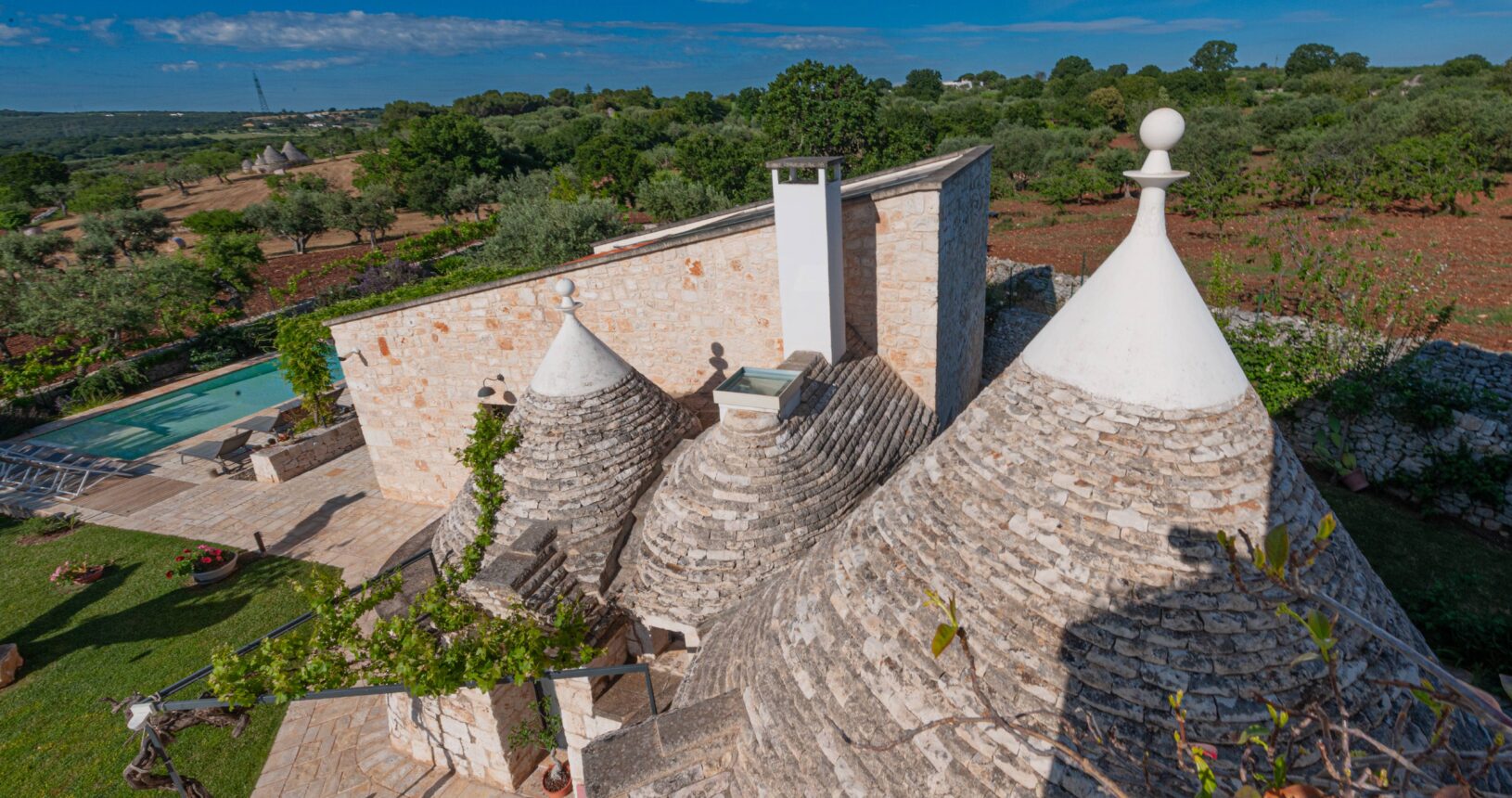 L’Aia di Cucumo è situata in una posizione panoramica del comune di Castellana Grotte, località conosciuta per le sue grotte sotterranee tra le più belle d’Italia, e dista circa 15 km da Alberobello, “la città dei trulli”, e 6 km da Putignano, conosciuta per la sua nota sfilata dei carri a Carnevale. Le è stato dato questo nome in quanto la struttura possiede una delle poche aie nella zona (ampia area in pietra di forma rettangolare che fino agli anni ‘70 serviva per battere e ventilare le spighe di frumento e separare la paglia dal grano) rimaste ben conservate, probabilmente l’unica nella contrada denominata “Cucumo”. Composta da quattro unità abitative indipendenti denominate Lamia, Fienile, Granaio e Palmento, per ricordare la destinazione d’uso che avevano in passato, L’Aia di Cucumo può ospitare fino a 18 persone, oppure essere locata per singoli appartamenti, condividendo in tal caso gli spazi in comune con altri ospiti. La struttura è dotata di una piscina rettangolare in pietra, un barbecue attrezzato per cucinare all’esterno e una serie di piccoli orti per la coltivazione di ortaggi di stagione a disposizione degli ospiti.