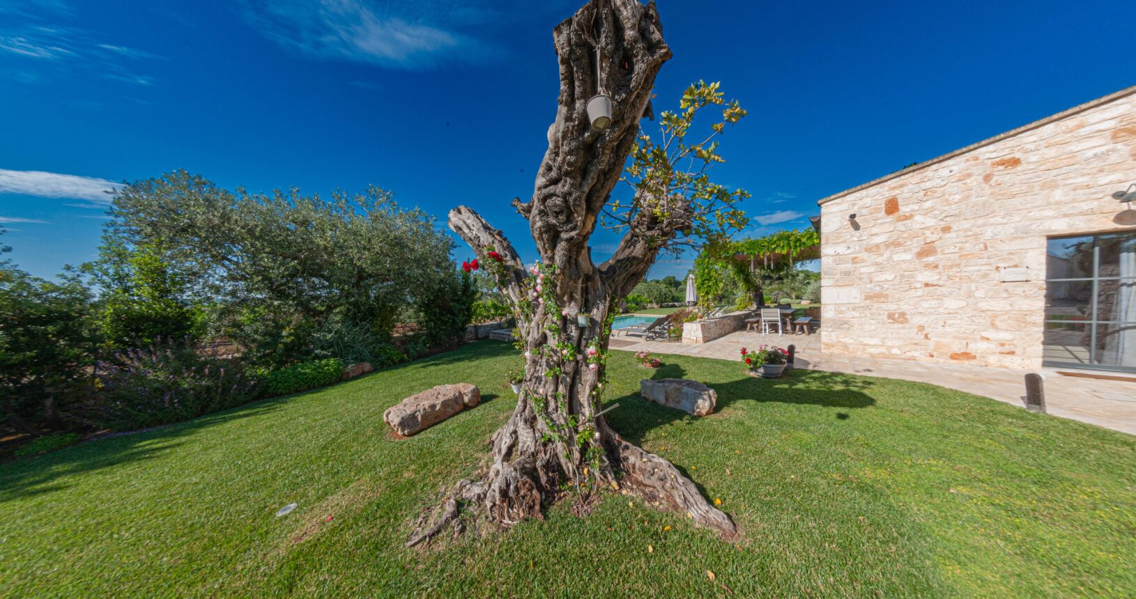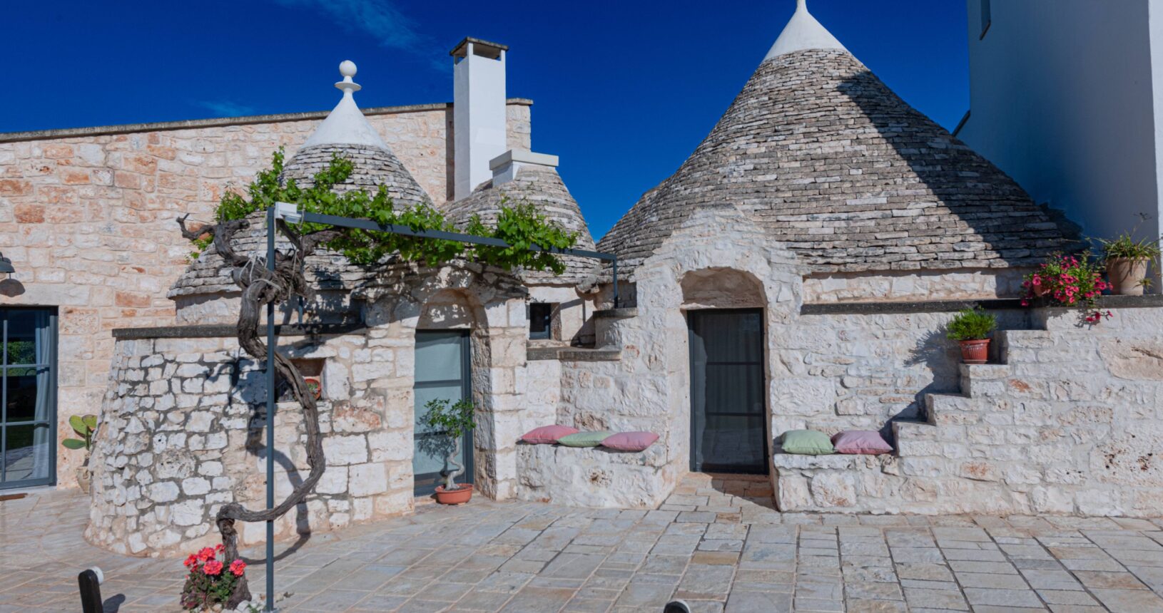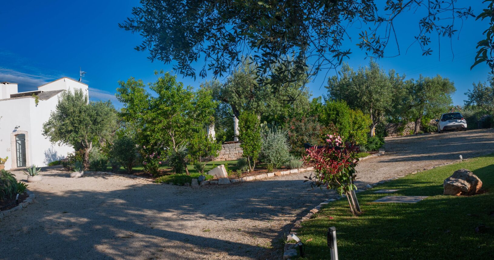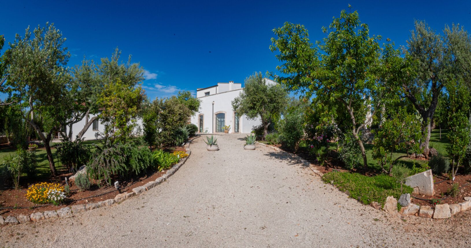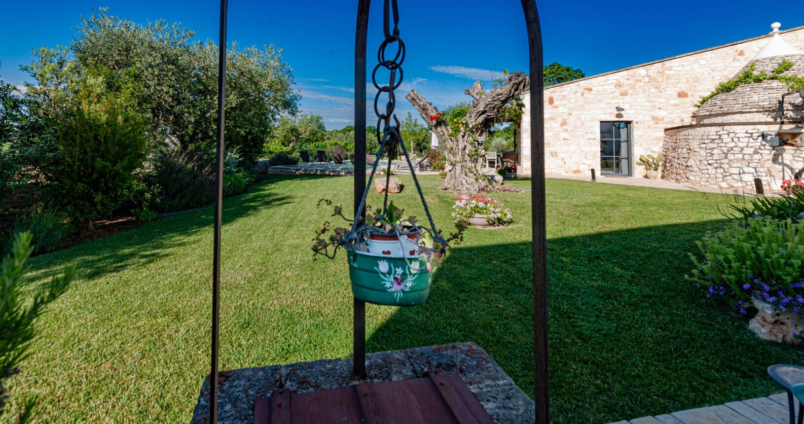 L’Aia di Cucumo è situata in una posizione panoramica del comune di Castellana Grotte, località conosciuta per le sue grotte sotterranee tra le più belle d’Italia, e dista circa 15 km da Alberobello, “la città dei trulli”, e 6 km da Putignano, conosciuta per la sua nota sfilata dei carri a Carnevale. Le è stato dato questo nome in quanto la struttura possiede una delle poche aie nella zona (ampia area in pietra di forma rettangolare che fino agli anni ‘70 serviva per battere e ventilare le spighe di frumento e separare la paglia dal grano) rimaste ben conservate, probabilmente l’unica nella contrada denominata “Cucumo”. Composta da quattro unità abitative indipendenti denominate Lamia, Fienile, Granaio e Palmento, per ricordare la destinazione d’uso che avevano in passato, L’Aia di Cucumo può ospitare fino a 18 persone, oppure essere locata per singoli appartamenti, condividendo in tal caso gli spazi in comune con altri ospiti. La struttura è dotata di una piscina rettangolare in pietra, un barbecue attrezzato per cucinare all’esterno e una serie di piccoli orti per la coltivazione di ortaggi di stagione a disposizione degli ospiti.