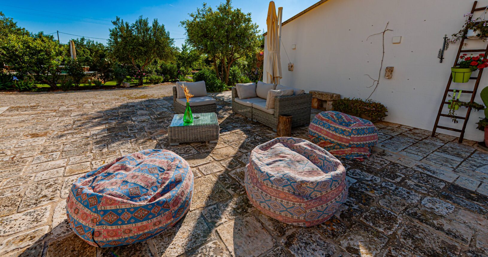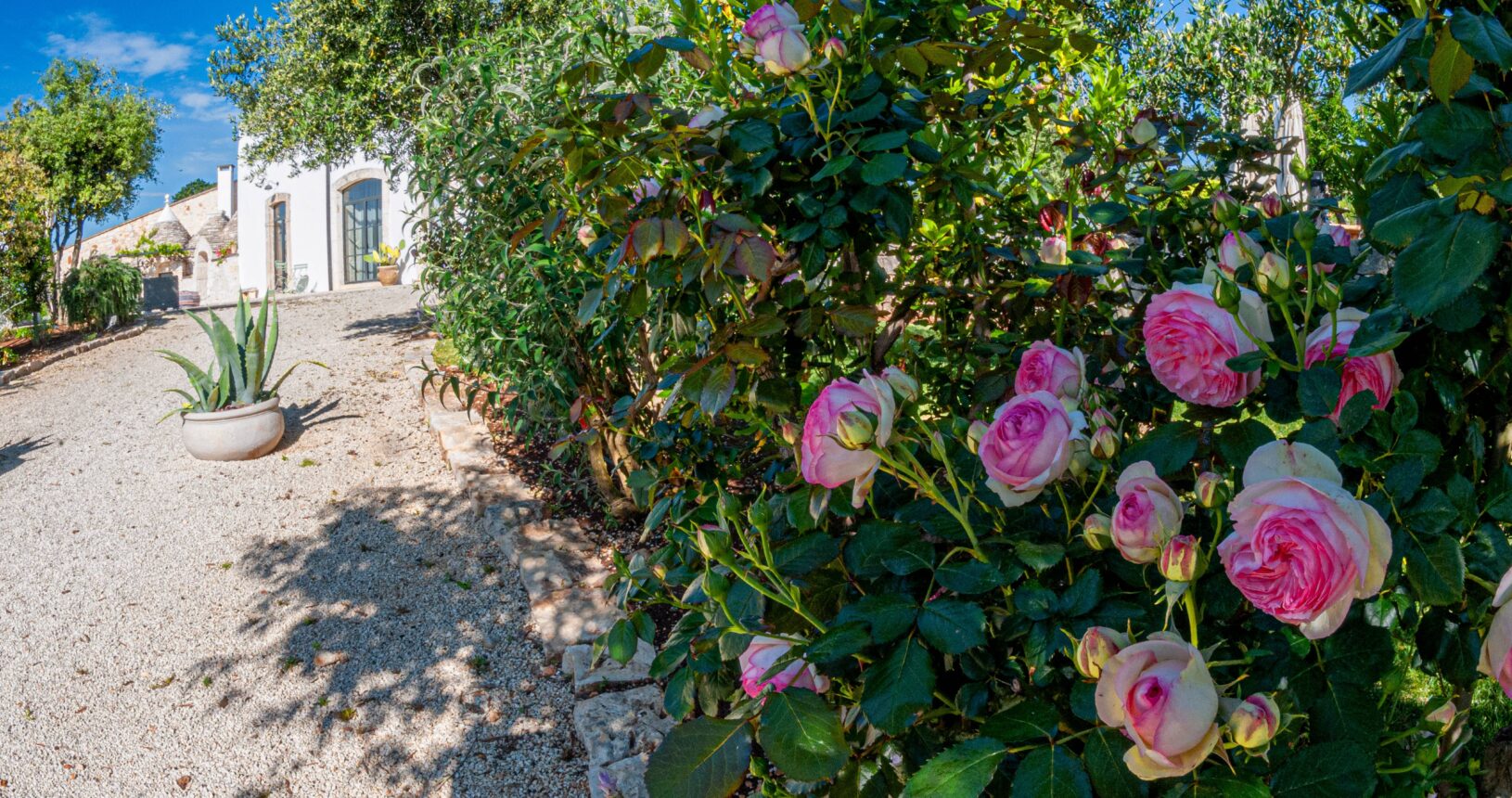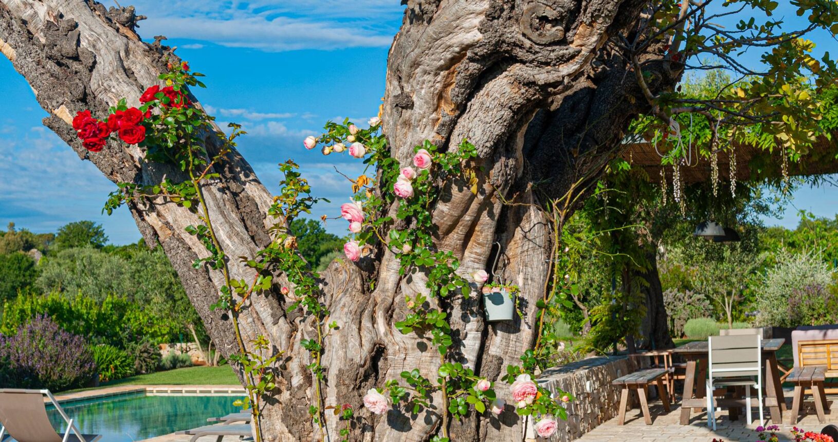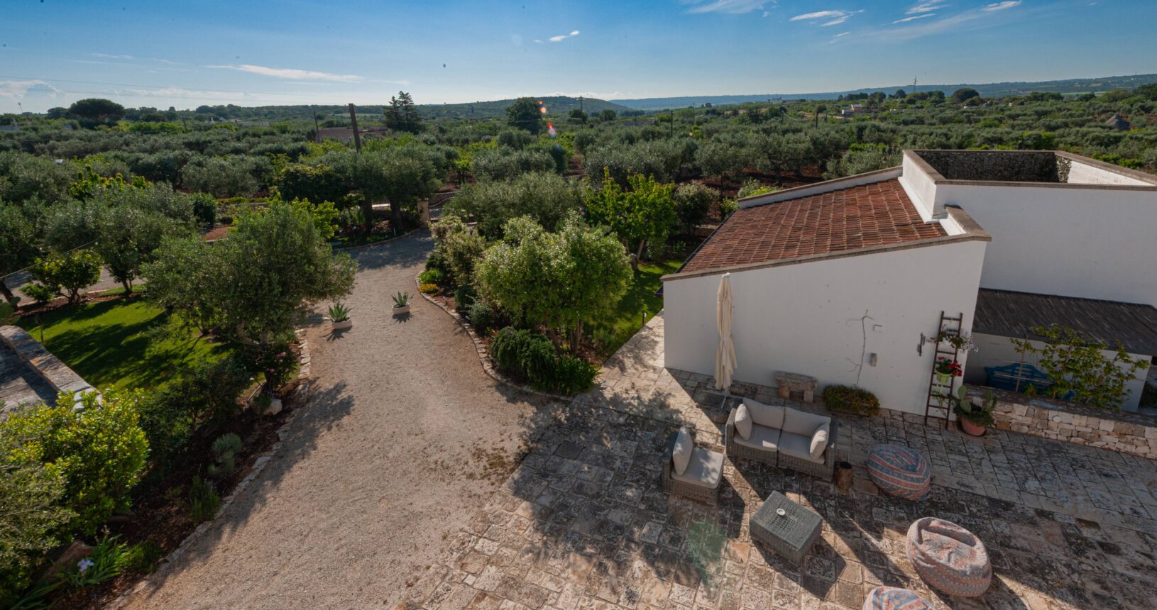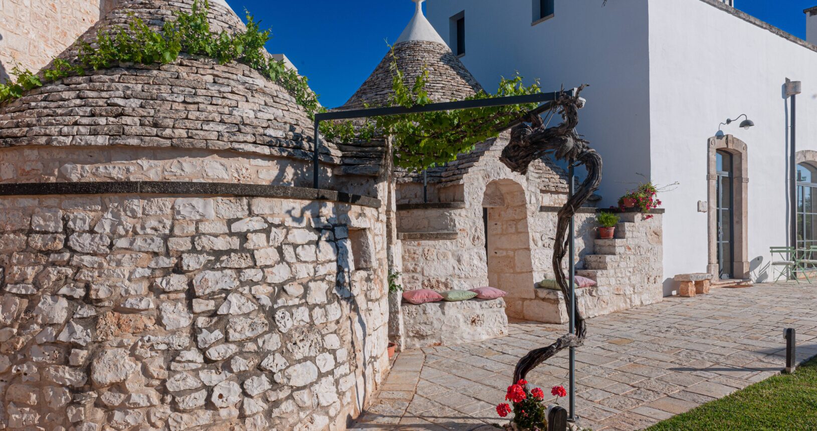 L’Aia di Cucumo è situata in una posizione panoramica del comune di Castellana Grotte, località conosciuta per le sue grotte sotterranee tra le più belle d’Italia, e dista circa 15 km da Alberobello, “la città dei trulli”, e 6 km da Putignano, conosciuta per la sua nota sfilata dei carri a Carnevale. Le è stato dato questo nome in quanto la struttura possiede una delle poche aie nella zona (ampia area in pietra di forma rettangolare che fino agli anni ‘70 serviva per battere e ventilare le spighe di frumento e separare la paglia dal grano) rimaste ben conservate, probabilmente l’unica nella contrada denominata “Cucumo”. Composta da quattro unità abitative indipendenti denominate Lamia, Fienile, Granaio e Palmento, per ricordare la destinazione d’uso che avevano in passato, L’Aia di Cucumo può ospitare fino a 18 persone, oppure essere locata per singoli appartamenti, condividendo in tal caso gli spazi in comune con altri ospiti. La struttura è dotata di una piscina rettangolare in pietra, un barbecue attrezzato per cucinare all’esterno e una serie di piccoli orti per la coltivazione di ortaggi di stagione a disposizione degli ospiti.